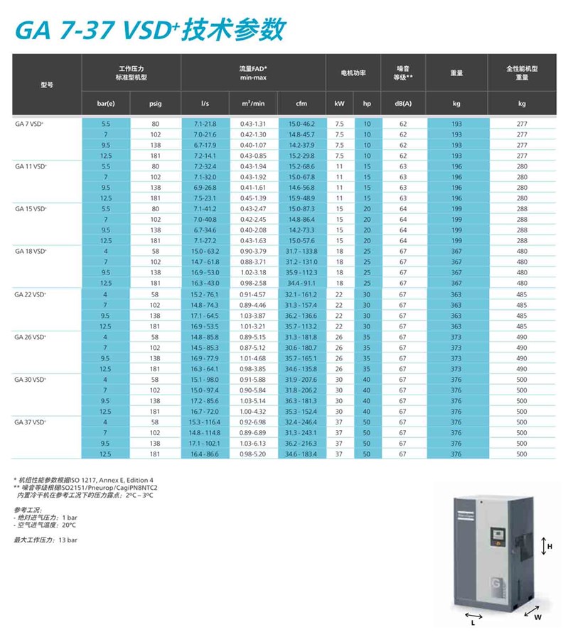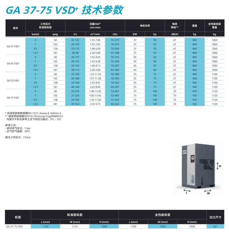 阿特拉斯·科普柯的GA7-110VSD + 系列空壓機標配變轉速驅動,內置永磁電機(IPM),結構緊湊、占地面積小,平均節能高達50%,可在惡劣的工況下穩定運行。GA7-110VSD + 超前的設計,在更長的運行時間內,實現成本縮減,并在壓縮機行業贏得廣泛關注和認可。